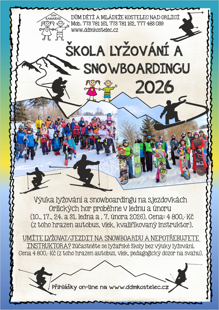 Zveme všechny zájemce na zimní sportovní zážitek! Ve spolupráci s DDM Kamarád Kostelec nad Orlicí nabízíme školu lyžování a snowboardingu pro děti i začátečníky.